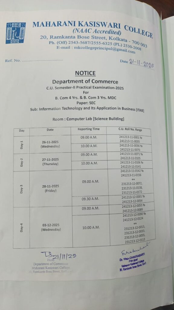 November 21, 2025 Exam Notice, Notice B.Com Sem2 Practical Examination 2025: SEC-ITAB Share on FacebookShare on X (Twitter)Share on WhatsappShare on TelegramShare on Email Related Articles Awareness Program by Internal Complaints committee Notice, Upcoming Events November 25, 2025 Submission of Registration Form Academic Notice, Notice November 25, 2025 GEOM Practical Examination,2025 (under CCF) Exam Notice, Notice November 21, 2025