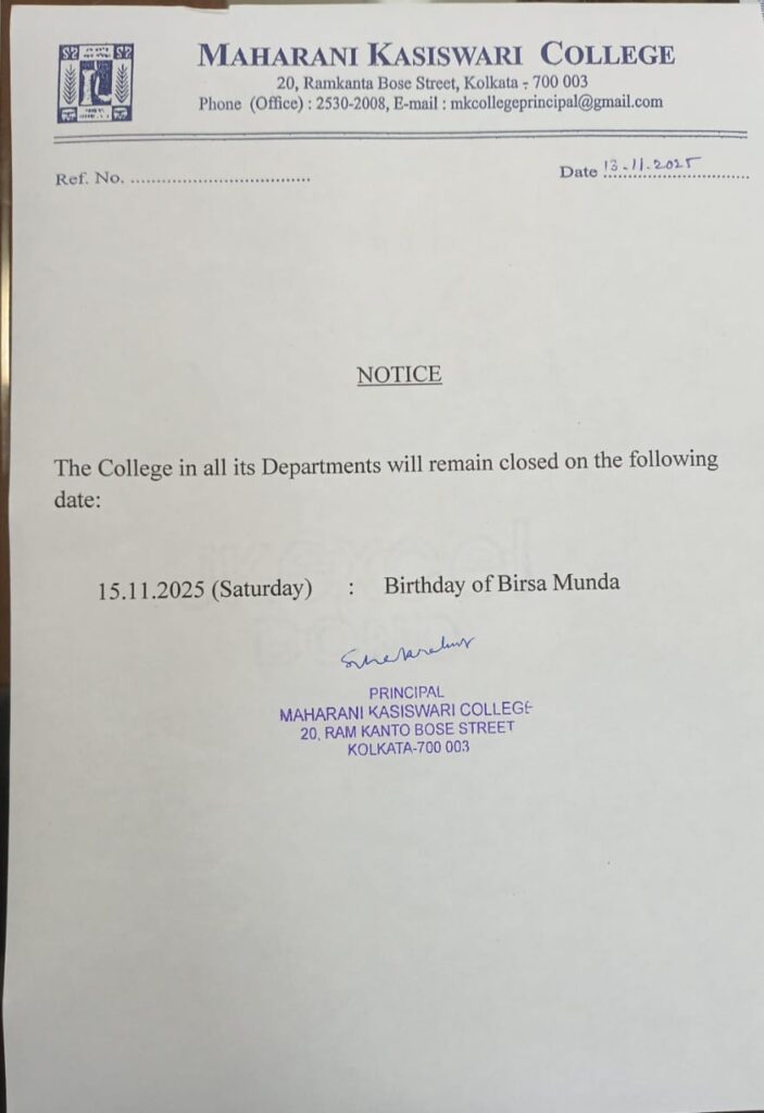 November 13, 2025 Administrative Notice, Notice Holiday: Birthday of Birsa Munda Share on FacebookShare on X (Twitter)Share on WhatsappShare on TelegramShare on Email Related Articles Awareness Program by Internal Complaints committee Notice, Upcoming Events November 25, 2025 Submission of Registration Form Academic Notice, Notice November 25, 2025 GEOM Practical Examination,2025 (under CCF) Exam Notice, Notice November 21, 2025