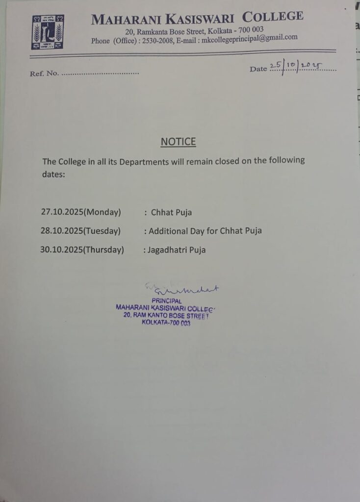 October 25, 2025 Administrative Notice, Notice Holidays: Chhat Puja & Jagadhatri Puja Share on FacebookShare on X (Twitter)Share on WhatsappShare on TelegramShare on Email Related Articles PTM Notice, Upcoming Events December 1, 2025 Review/F.S.I form fill up: B.A & B.Sc (Hons+Gen+Major): Sem4 (CCF & CBCS) Academic Notice, Notice December 1, 2025 Holidays: Foundation Day, Death Anniversary of Maharani Kasiswari Nandy Administrative Notice, Notice December 1, 2025