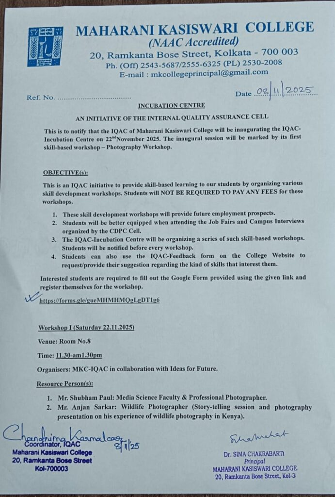November 8, 2025 Notice, Upcoming Events Inaugural Session of IQAC-Incubation Centre: first skill based workshop – Photography Workshop Share on FacebookShare on X (Twitter)Share on WhatsappShare on TelegramShare on Email Related Articles Awareness Program by Internal Complaints committee Notice, Upcoming Events November 25, 2025 Submission of Registration Form Academic Notice, Notice November 25, 2025 GEOM Practical Examination,2025 (under CCF) Exam Notice, Notice November 21, 2025