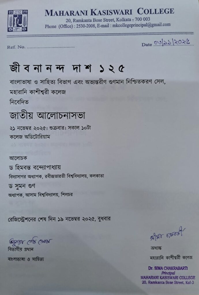 November 3, 2025 Notice, Upcoming Events National Seminar: Jibanananda Das 125 Share on FacebookShare on X (Twitter)Share on WhatsappShare on TelegramShare on Email Related Articles Awareness Program by Internal Complaints committee Notice, Upcoming Events November 25, 2025 Submission of Registration Form Academic Notice, Notice November 25, 2025 GEOM Practical Examination,2025 (under CCF) Exam Notice, Notice November 21, 2025