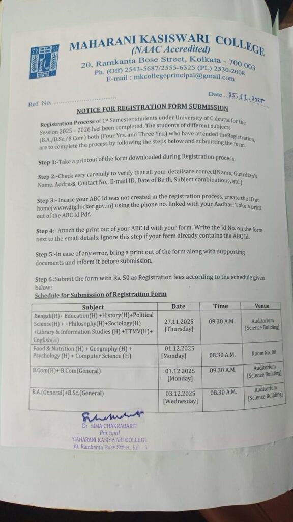 November 25, 2025 Academic Notice, Notice Submission of Registration Form Share on FacebookShare on X (Twitter)Share on WhatsappShare on TelegramShare on Email Related Articles Awareness Program by Internal Complaints committee Notice, Upcoming Events November 25, 2025 GEOM Practical Examination,2025 (under CCF) Exam Notice, Notice November 21, 2025 B.Com Sem2 Practical Examination 2025: SEC-ITAB Exam Notice, Notice November 21, 2025