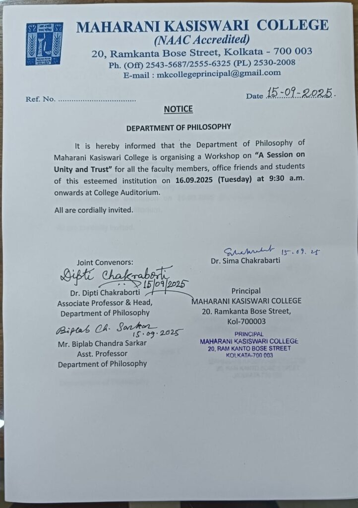 September 15, 2025 Notice, Upcoming Events Workshop: “A Session on Unity & trust” Share on FacebookShare on X (Twitter)Share on WhatsappShare on TelegramShare on Email Related Articles PTM Notice, Upcoming Events December 1, 2025 Review/F.S.I form fill up: B.A & B.Sc (Hons+Gen+Major): Sem4 (CCF & CBCS) Academic Notice, Notice December 1, 2025 Holidays: Foundation Day, Death Anniversary of Maharani Kasiswari Nandy Administrative Notice, Notice December 1, 2025